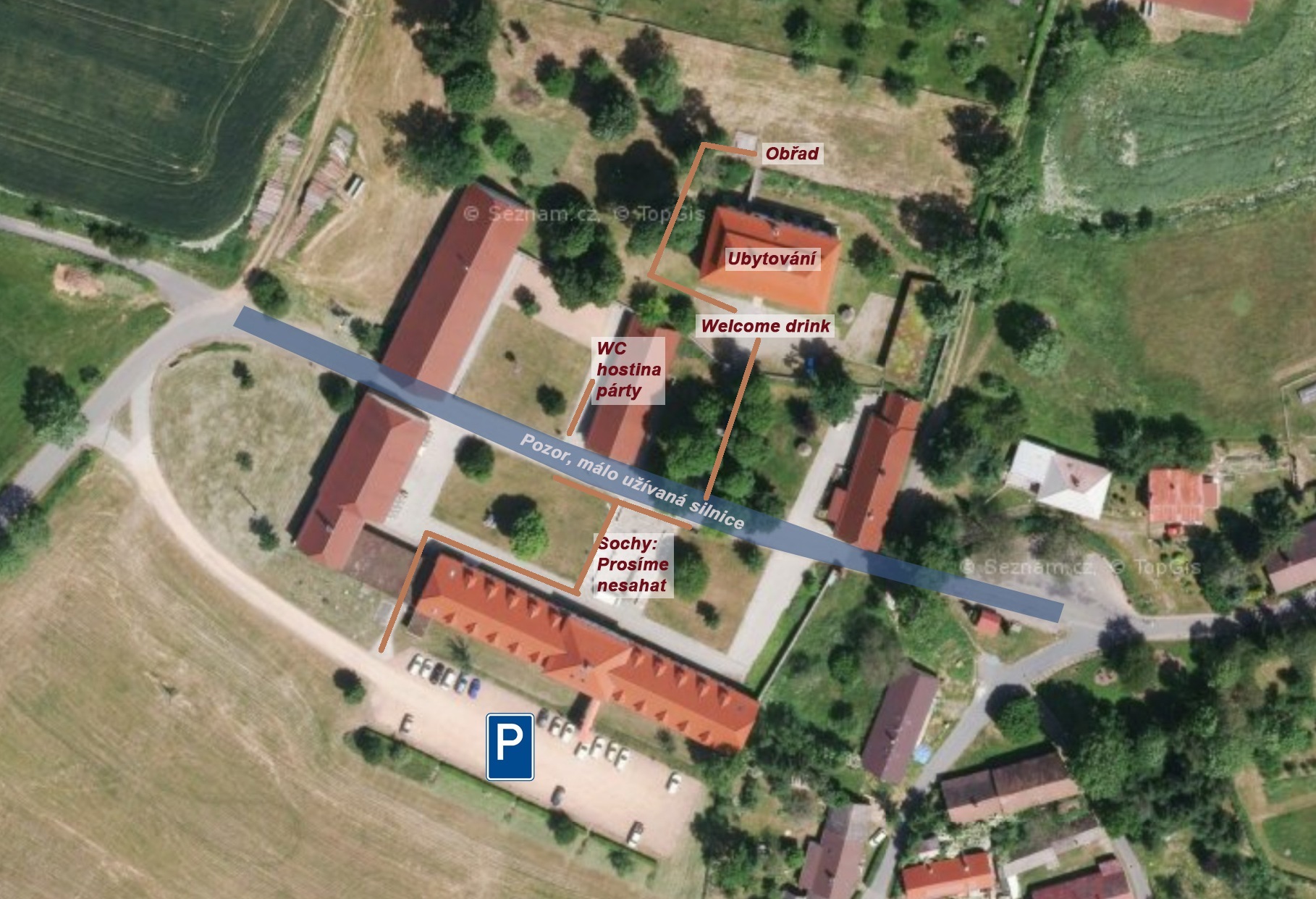 Následně bude již vše probíhat v okolí jídelny - hostina i večerní zábava. Návštěvníky s dětmi prosíme, dohlédněte na ně. V areálu jsou rozmístěny sochy, které jsou umělecká díla. Prostorem kolem jídelny bohužel prochází silnice - je sice málo užívaná, ale stále silnice.